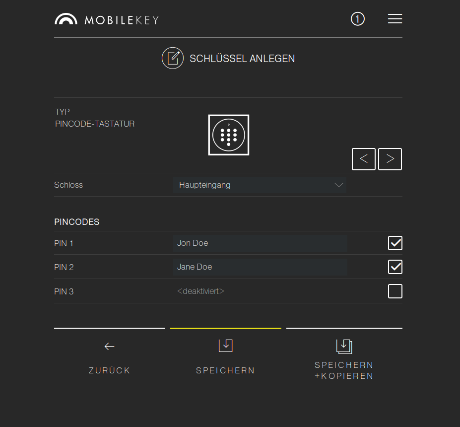 In diesem Menü können Sie der PinCode-Tastatur ein Schloss zuweisen. In unserem Fall ist es das Schloss „Haupteingang“, nun können Sie entscheiden wer Zugriff hat. Wir entscheiden uns für Jon und Jane Doe. Nachdem Sie alles konfiguriert haben, klicken Sie auf den Speichern-Button und Sie werden sehen beide Personen haben nun Zugriff auf das Schloss und können mit ihrer PIN das Schloss öffnen. Auch hier gilt wieder, falls SIe Änderungen vornehmen müssen einfach auf die jeweilige Person oder die PinCode-Tastatur direkt klicken.