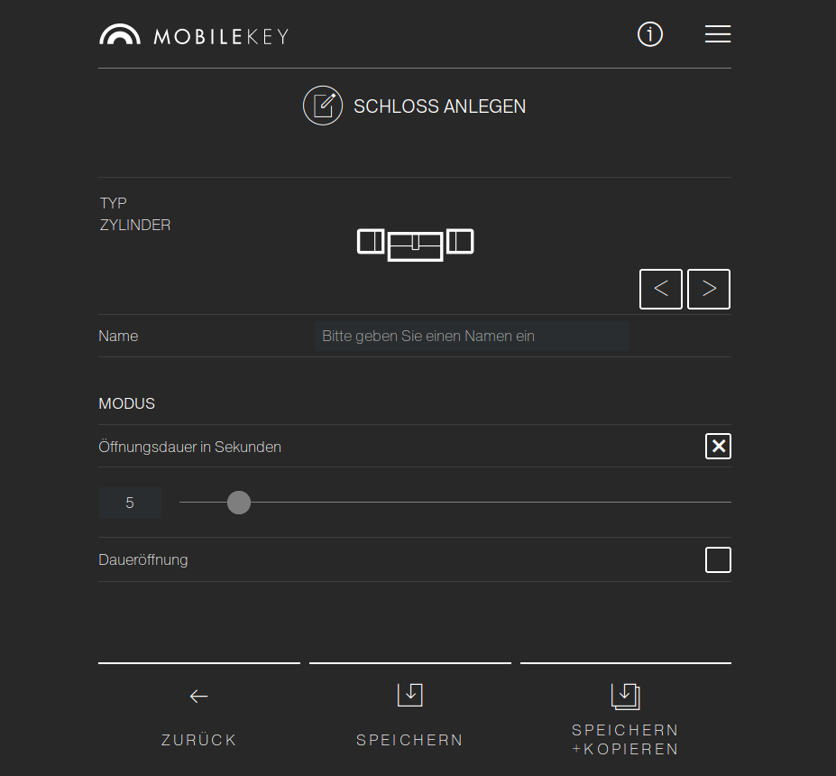 Nachdem Sie sich also für Ihr vorhandendes Schloss entschieden haben, in diesem Beispiel wählen wir ein Zylinderschloss, können Sie anfangen das Schloss zu konfigurieren. Wir tragen den Namen des Schlosses ein und können entscheiden, zwischen einer festen Öffnungszeit in Sekunden oder Daueröffnung. Wenn Sie mit den Einstellungen zufrieden sind, einfach auf den gelb hervorgehobenen Speichern-Button klicken. Et voilà, das Schloss wurde in die Matrix übernommen. Falls Sie Änderungen am Schloss vornehmen müssen einfach auf das Schloss in der Matrix klicken und im anschließenden Menü, bearbeiten auswählen.